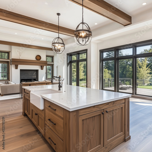 Traditional kitchen in beautiful new luxury home with hardwood floors, wood beams, and large island quartz counters. Includes farmhouse sink, elegant pendant lights, and large windows