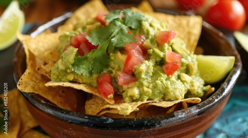Traditional Mexican snack of nachos served with guacamole made from avocado tomato onion garlic and lemon