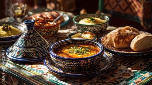 Traditional moroccan harira soup with couscous, bread, and tagine on colorful table