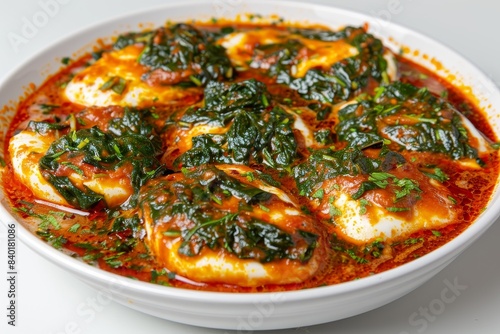 Traditional Nigerian soup with assorted meats and leafy greens, served in a white bowl, perfect for a nutritious meal