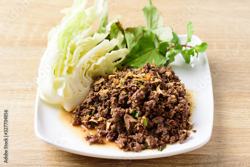 Traditional Northern Thai food, spicy minced pork salad (Larb Moo Kua)