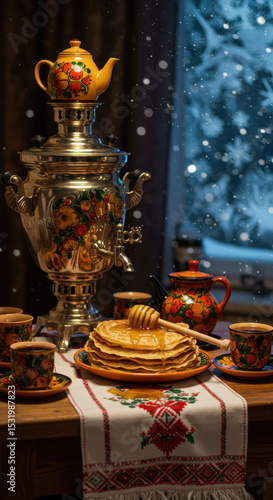 Traditional russian tea setup with samovar and honey pancakes in cozy winter scene