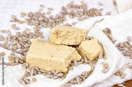 Traditional sweet turkish delight halva pieces with sunflower seeds on light background.