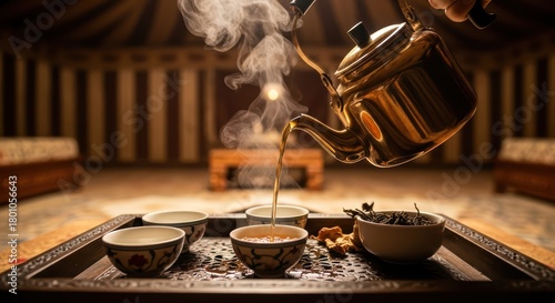 Traditional tea ceremony in cozy tent setting with steam and ceramic cups