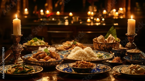 Traditional thai khantoke feast displaying an array of delicious dishes on a beautifully set dining table