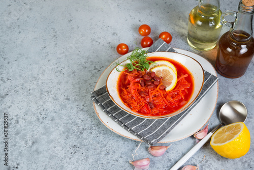 Traditional Ukrainian borsch with red beans in a white plate stands on a gray concrete background. Top view with copy space.