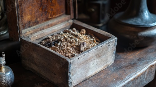 Traditional wooden box filled with dried herbs and roots on an antique wooden table, offering a glimpse of ancient healing practices.