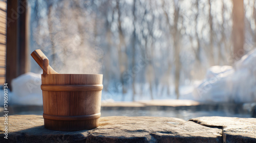 Traditional wooden sauna bucket with steam near outdoor hot spring winter. Cold plunge and winter swim wellness.