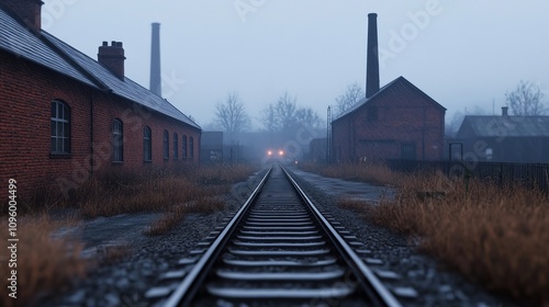 Train Tracks Vanishing into Fog: A moody, atmospheric image of train tracks receding into a dense fog, flanked by aged brick buildings and industrial chimneys.