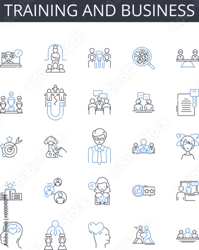 Training and business line icons collection. Learning and commerce, Instruction and industry, Education and enterprise, Coaching and trade, Teaching and economy, Tutoring and market, Guidance and