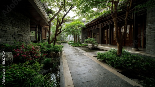 Tranquil Asian courtyard garden path lined with lush greenery.