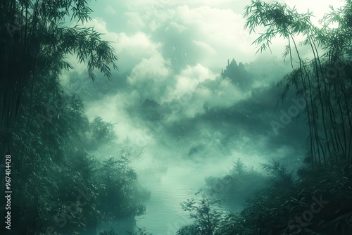 tranquil bamboo forest in teal hues misty atmosphere zeninspired landscape serene asian garden setting