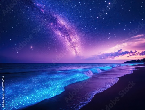 Tranquil Beach Scene under a Starry Milky Way Sky with Gentle Waves Lapping at the Shore Creating a Dreamy Nighttime Atmosphere and Serenity