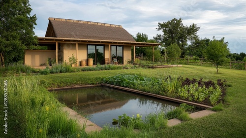 Tranquil Eco-Friendly Straw Bale House with Thatched Roof and Sustainable Features Surrounded by Organic Gardens and Pond, Photorealistic