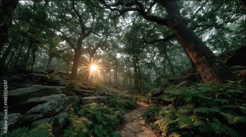 Tranquil Foggy Forest with Sunlight Peeking Through the Trees