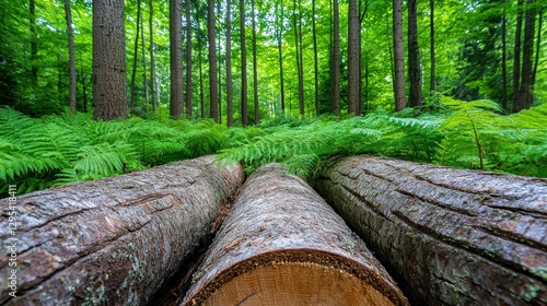 Tranquil Forest Scene with Logs and Lush Green Ferns