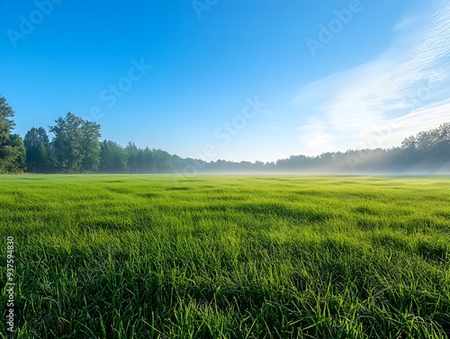 Tranquil Meadow at Dawn with Clear Blue Sky and Lush Green Grass