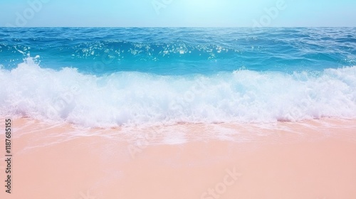 Tranquil ocean waves gently crashing on sandy beach under clear blue sky