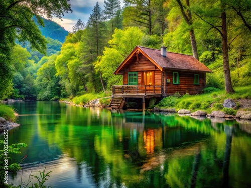 Tranquil River Cabin Surrounded by Lush Greenery and Serene Water in a Picturesque Landscape