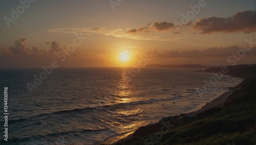 Tranquil Sea at Sunset with Waves Rolling Towards a Green Hillside