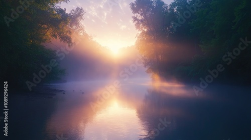 Tranquil summer sunrise casting gentle light over misty riverbanks and reflecting softly on calm waters surrounded by lush trees