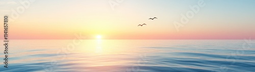Tranquil Sunrise Over Calm Ocean Waters with Soft Pastel Colors and Silhouetted Birds Flying in the Distance Creating a Serene Coastal Atmosphere