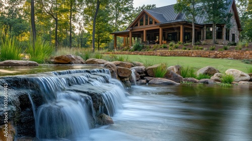 Tranquil waterfall cascading into a pond in front of a stone and wood house.