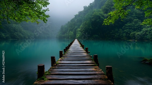 Tranquil wooden bridge arching over a calm misty river flowing through a lush verdant forest landscape The weathered planks and rails of the bridge lead the eye across the serene waters