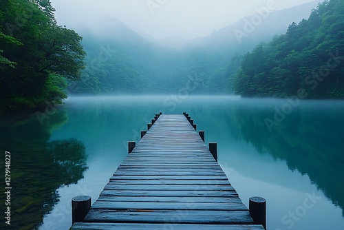 Tranquil Wooden Pier Leads Through Misty Mountain Lake