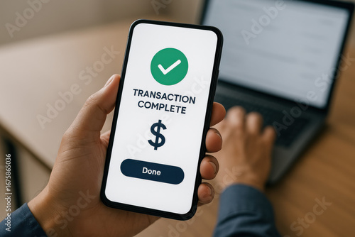 Transaction complete message on smartphone screen held by person using laptop