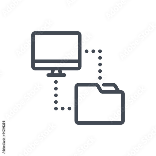 Transfer data from computer to folder line icon. PC with connection to file folder vector outline sign.