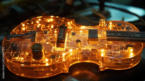 Transparent amber violin with illuminated circuitry.