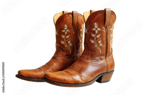 [Transparent Background PNG]Pair of Brown Leather Cowboy Boots with Embroidered Design