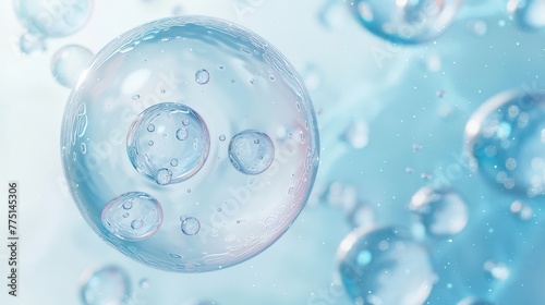 transparent cells floating on a light blue background, surrounded by small cells and bubbles