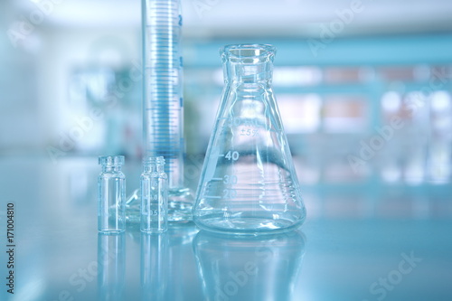 transparent chemical research glassware, flask cylinder vial innovation laboratory background