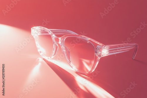 Transparent eyeglasses are resting upon a beautiful reflective surface