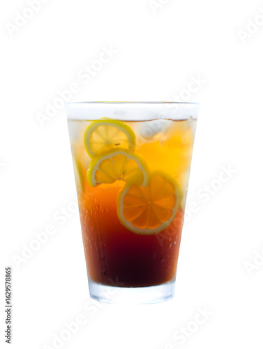 Transparent Of Iced tea with lemon slices in a clear glass against a black background