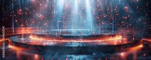 Transparent podium with a floating effect, highlighted by bright, focused lights.
