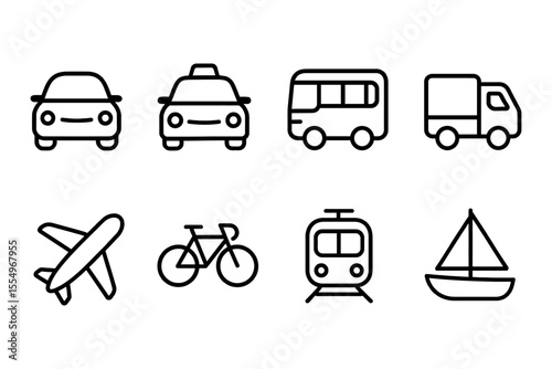Transportation icons set featuring car, taxi, bus, truck, airplane, bicycle, train, and boat, vector illustration