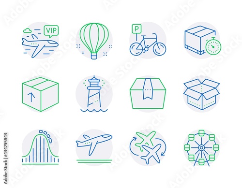 Transportation icons set. Included icon as Package, Package box, Vip flight signs. Lighthouse, Roller coaster, Open box symbols. Delivery timer, Connecting flight, Departure plane. Vector