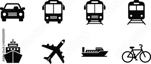 Transportation icons set including car, bus, train, ship, airplane, bicycle, travel symbols, public transit, commuting, urban mobility, vehicle, transport, travel options, transportation modes.