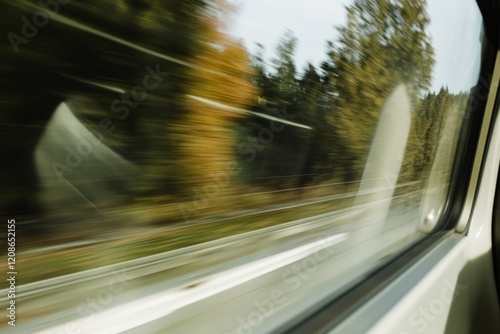 Transportation of people by large bus, speed is depicted through the bus window. Generative AI