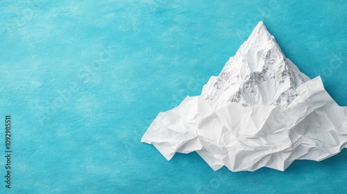 Travel Adventures Through Scenic Landscapes, Crumpled white paper resembles a mountain peak on a vibrant blue background, creating a surreal and artistic visual effect.