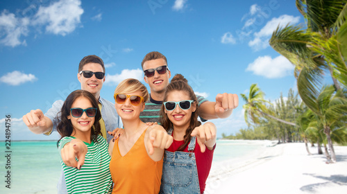 travel, summer holidays and people concept - group of happy smiling friends in sunglasses pointing at you over tropical beach background in french polynesia