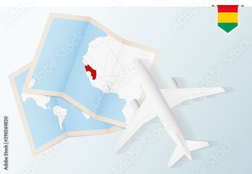 Travel to Guinea, top view airplane with map and flag of Guinea.