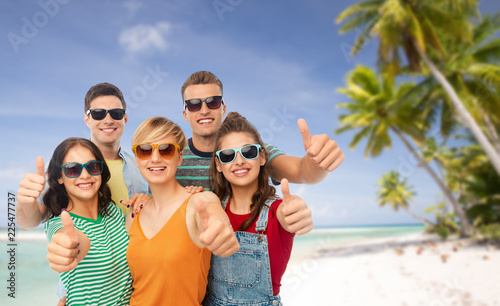 travel, tourism and summer holidays concept - group of happy smiling friends in sunglasses showing thumbs up over tropical beach background in french polynesia