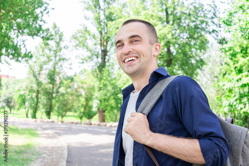 Traveller with a backpack walking down the road and laughing, portrait, toned