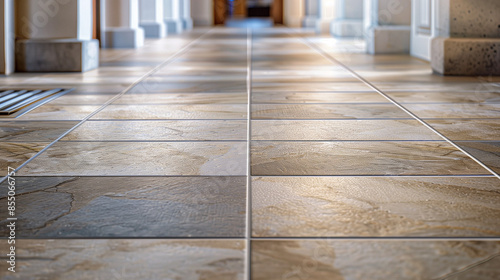 Travertine like ceramic tiles in the design of the hall in the house. Ancient greek style