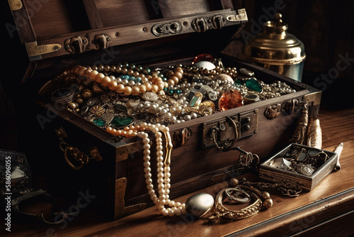 Treasure chest, brimming with sparkling jewels and golden objects, evoking a sense of adventure, wealth, and excitement. Ai generated