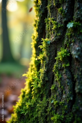 Tree bark covered in moss and lichen early morning, early morning, tree bark